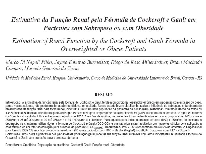 Coresh J et al. Calibration and random variation of the serum creatinine assay as critical elements of using equations to estimate glomerular filtration rate. Am J Kidney Dis 2002; 39: (variação da Crs 0. 23 mg/dl ) Froissart M et al. Predictive performance of the modification of diet in renal disease and Cockcroft. Gault equations for estimating renal function. J Am Soc Nephrol 2005; 16: (MDRD Crs=1. 151(Cr s medida em mg%) - 0. 107. Hallan S et al. Validation of the Modification of Diet in Renal Disease formula for estimating GFR with special emphasis on calibration of the serum creatinine assay. Am J Kidney Dis 2004; 44: 84– 93 ( MDRDCrs =1. 06(Crs medida em mg%) - 0. 16; Toffaletti et al. Na automated dry-slide enzymatic method evaluated for measurement of creatinine in serum. Clin Chem 1983; 29: 684– 687 (MDRDCr mg/L= (0. 89 x Cr medida em mg/L+2, 4)/0. 99.