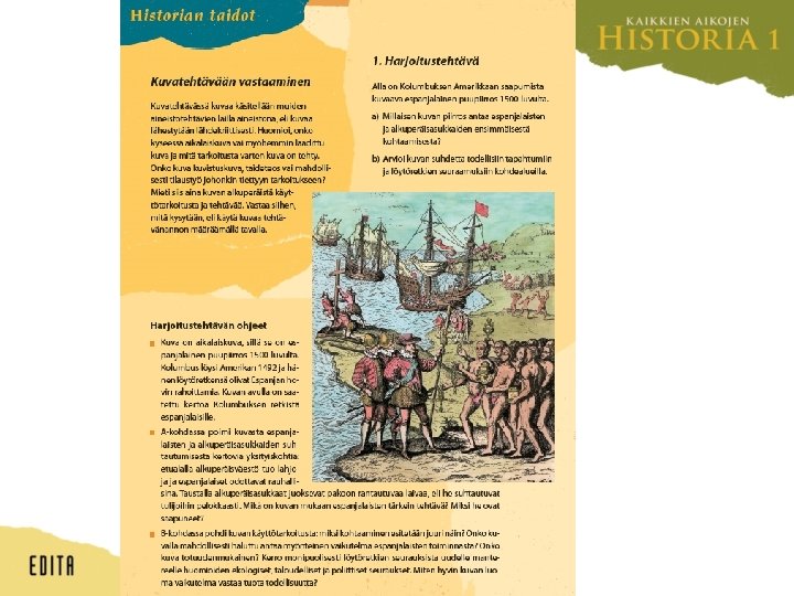 1. Harjoitustehtävä • Kuva on aikalaiskuva, sillä se on espanjalainen puupiirros 1500 -luvulta. Kolumbus löysi Amerikan 1492 ja hänen löytöretkensä olivat Espanjan hovin rahoittamia. Kuvan avulla on saatettu kertoa Kolumbuksen retkistä espanjalaisille. • A-kohdassa poimi kuvasta espanjalaisten ja alkuperäisasukkaiden suhtautumisesta kertovia yksityiskohtia: etualalla alkuperäisväestö tuo lahjoja ja espanjalaiset odottavat rauhallisina. Taustalla alkuperäisasukkaat juoksevat pakoon rantautuvaa laivaa, eli he suhtautuvat tulijoihin pelokkaasti. Mikä on kuvan mukaan espanjalaisten tärkein tehtävä? Miksi he ovat saapuneet? • B-kohdassa pohdi kuvan käyttötarkoitusta: miksi kohtaaminen esitetään juuri näin? Onko kuvalla mahdollisesti haluttu antaa myönteinen vaikutelma espanjalaisten toiminnasta? Onko kuva totuudenmukainen? Kerro monipuolisesti löytöretkien seurauksista uudelle mantereelle huomioiden ekologiset, taloudelliset ja poliittiset seuraukset. Miten hyvin kuvan luoma vaikutelma vastaa tuota todellisuutta?