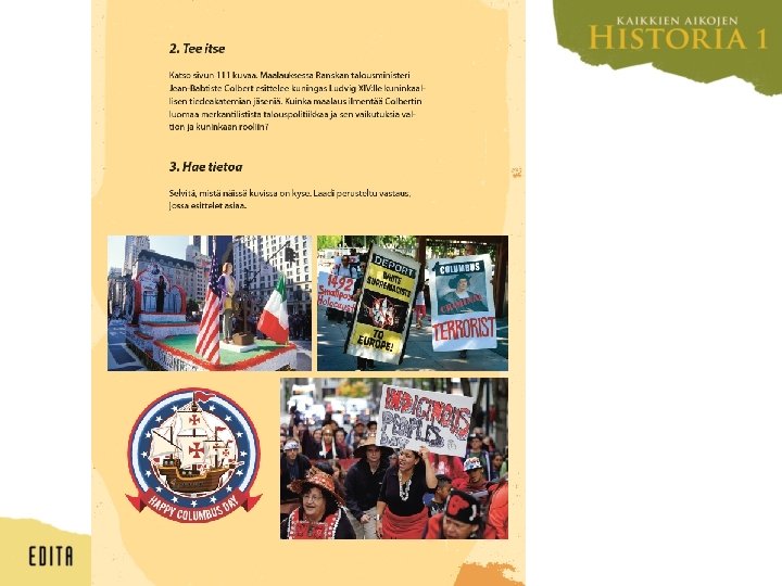 3. Hae tietoa • Selvitä kuvissa esiintyvistä vihjeistä mitä niissä tapahtuu: Columbus Day ja Indigenous People’s Day. • Selvitä, miksi ja ketkä Kolumbuksen päivää viettävät ja ketkä ja miksi sitä vastustavat. • Miksi kahdensuuntainen viesti: onnellisen Kolumbuksen päivän toivottamista ja toisaalta Kolumbuksen pitämistä rikollisena ja terroristina? • Kyseessä alkuperäisväestön kritiikki Yhdysvalloissa kansallisena vapaapäivänä vietettävää Kolumbuksen päivää kohtaan.
