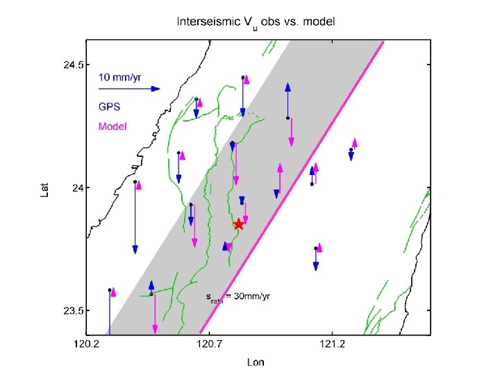 Testing the seismic cycle model from the 1999 Chi-Chi 09/20/1999, Mw=7. 6 earthquake Ground displacements as measured by GPS – Interseismic displacements before the Chichi EQ (black arrows) – Coseismic displacements due to Chichi EQ (red arrows)