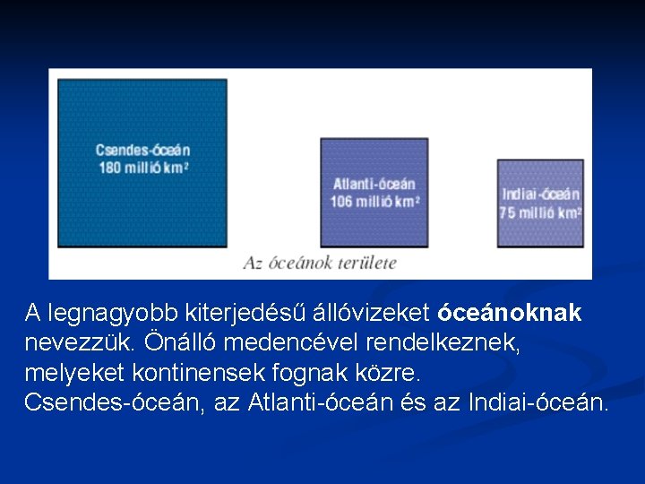 A legnagyobb kiterjedésű állóvizeket óceánoknak nevezzük. Önálló medencével rendelkeznek, melyeket kontinensek fognak közre. Csendes-óceán, az Atlanti-óceán és az Indiai-óceán.