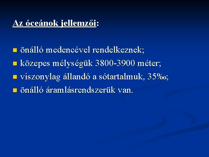 Az óceánok jellemzői: önálló medencével rendelkeznek; n közepes mélységük 3800 -3900 méter; n viszonylag állandó a sótartalmuk, 35‰; n önálló áramlásrendszerük van. n