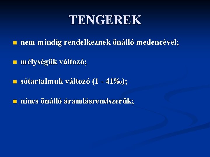 TENGEREK n nem mindig rendelkeznek önálló medencével; n mélységük változó; n sótartalmuk változó (1 - 41‰); n nincs önálló áramlásrendszerük;