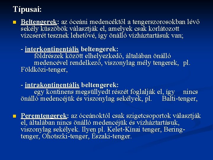 Típusai: n Beltengerek: az óceáni medencéktől a tengerszorosokban lévő sekély küszöbök választják el, amelyek csak korlátozott vízcserét tesznek lehetővé, így önálló vízháztartásuk van; - interkontinentális beltengerek: földrészek között elhelyezkedő, általában önálló medencével rendelkező, viszonylag mély tengerek, pl. Földközi-tenger, - intrakontinentális beltengerek: egy kontinens megsüllyedt részét foglalják el, így nincs önálló medencéjük és viszonylag sekélyek, pl. Balti-tenger, n Peremtengerek: az óceánoktól csak szigetcsoportok választják el, általában nincs önálló medencéjük és vízháztartásuk, viszonylag sekélyek. Ilyen pl. Kelet-Kínai tenger, Beringtenger, Ohotszki-tenger, Északi-tenger.