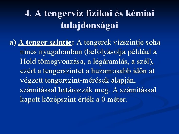 4. A tengervíz fizikai és kémiai tulajdonságai a) A tenger szintje: A tengerek vízszintje soha nincs nyugalomban (befolyásolja például a Hold tömegvonzása, a légáramlás, a szél), ezért a tengerszintet a huzamosabb időn át végzett tengerszint-mérések alapján, számítással határozzák meg. A számítással kapott középszint érték a 0 méter.