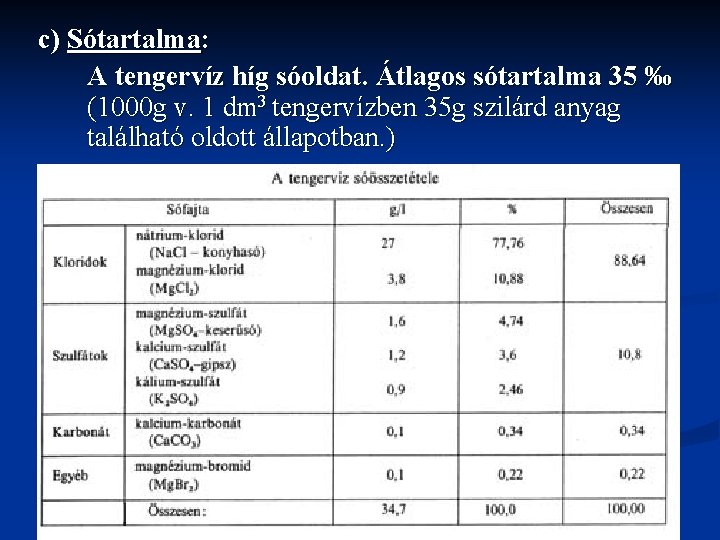 c) Sótartalma: A tengervíz híg sóoldat. Átlagos sótartalma 35 ‰ (1000 g v. 1 dm 3 tengervízben 35 g szilárd anyag található oldott állapotban. )