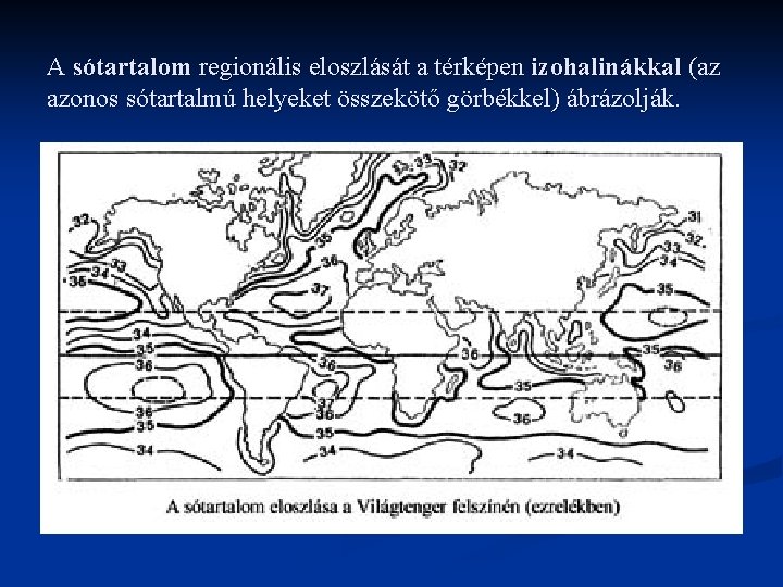 A sótartalom regionális eloszlását a térképen izohalinákkal (az azonos sótartalmú helyeket összekötő görbékkel) ábrázolják.