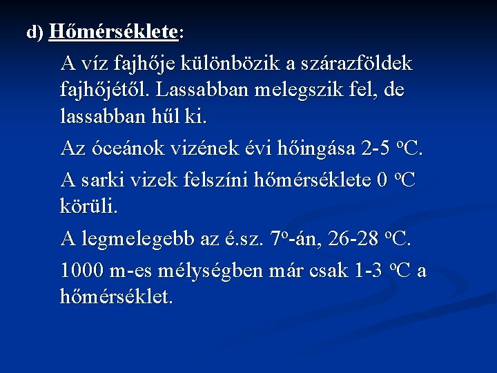 d) Hőmérséklete: A víz fajhője különbözik a szárazföldek fajhőjétől. Lassabban melegszik fel, de lassabban hűl ki. Az óceánok vizének évi hőingása 2 -5 o. C. A sarki vizek felszíni hőmérséklete 0 o. C körüli. A legmelegebb az é. sz. 7 o-án, 26 -28 o. C. 1000 m-es mélységben már csak 1 -3 o. C a hőmérséklet.