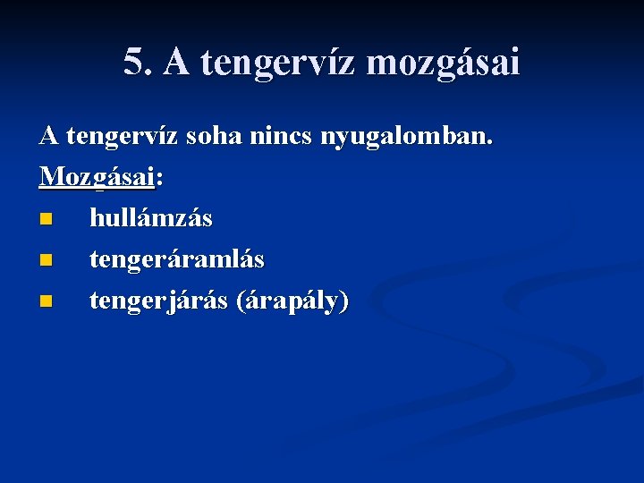 5. A tengervíz mozgásai A tengervíz soha nincs nyugalomban. Mozgásai: n hullámzás n tengeráramlás n tengerjárás (árapály)