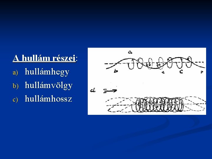 A hullám részei: a) hullámhegy b) hullámvölgy c) hullámhossz
