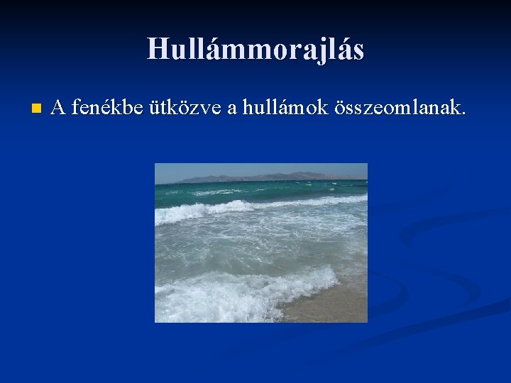 Hullámmorajlás n A fenékbe ütközve a hullámok összeomlanak.
