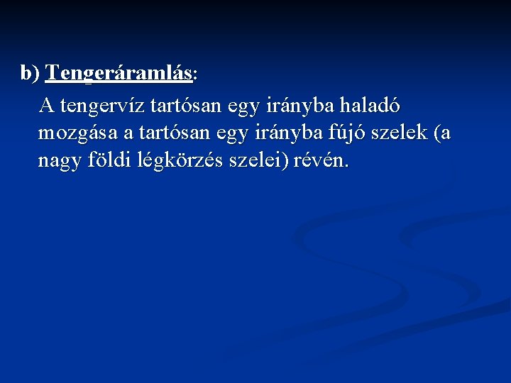 b) Tengeráramlás: A tengervíz tartósan egy irányba haladó mozgása a tartósan egy irányba fújó szelek (a nagy földi légkörzés szelei) révén.