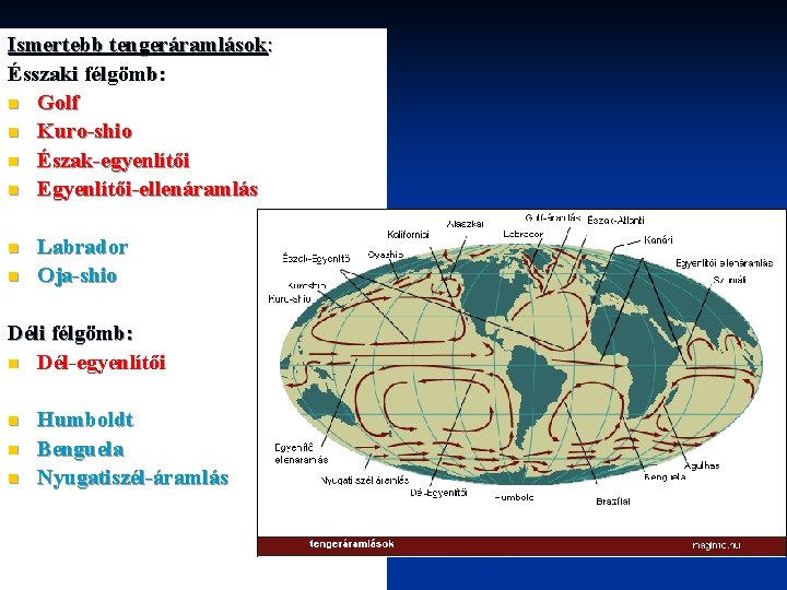 Ismertebb tengeráramlások: Ésszaki félgömb: n Golf n Kuro-shio n Észak-egyenlítői n Egyenlítői-ellenáramlás n n Labrador Oja-shio Déli félgömb: n Dél-egyenlítői n n n Humboldt Benguela Nyugatiszél-áramlás