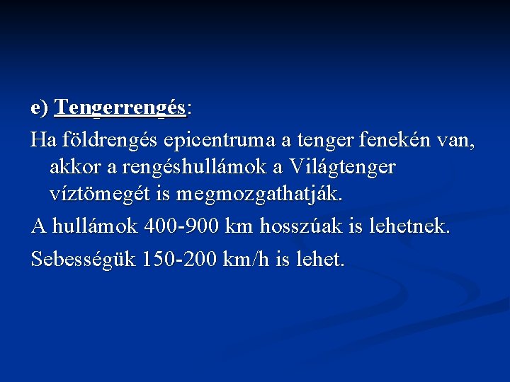 e) Tengerrengés: Ha földrengés epicentruma a tenger fenekén van, akkor a rengéshullámok a Világtenger víztömegét is megmozgathatják. A hullámok 400 -900 km hosszúak is lehetnek. Sebességük 150 -200 km/h is lehet.
