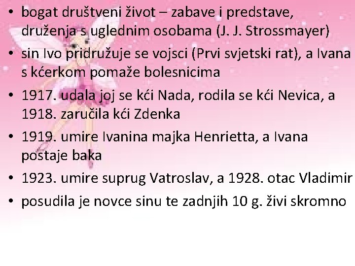 • bogat društveni život – zabave i predstave, druženja s uglednim osobama (J. J. Strossmayer) • sin Ivo pridružuje se vojsci (Prvi svjetski rat), a Ivana s kćerkom pomaže bolesnicima • 1917. udala joj se kći Nada, rodila se kći Nevica, a 1918. zaručila kći Zdenka • 1919. umire Ivanina majka Henrietta, a Ivana postaje baka • 1923. umire suprug Vatroslav, a 1928. otac Vladimir • posudila je novce sinu te zadnjih 10 g. živi skromno