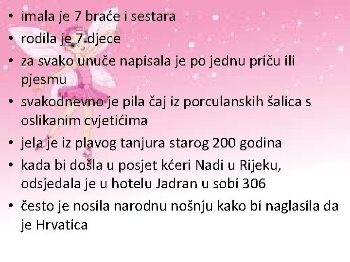 • imala je 7 braće i sestara • rodila je 7 djece • za svako unuče napisala je po jednu priču ili pjesmu • svakodnevno je pila čaj iz porculanskih šalica s oslikanim cvjetićima • jela je iz plavog tanjura starog 200 godina • kada bi došla u posjet kćeri Nadi u Rijeku, odsjedala je u hotelu Jadran u sobi 306 • često je nosila narodnu nošnju kako bi naglasila da je Hrvatica