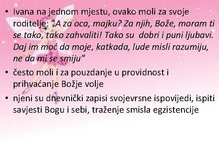 • Ivana na jednom mjestu, ovako moli za svoje roditelje: ”A za oca, majku? Za njih, Bože, moram ti se tako, tako zahvaliti! Tako su dobri i puni ljubavi. Daj im moć da moje, katkada, lude misli razumiju, ne da mi se smiju” • često moli i za pouzdanje u providnost i prihvaćanje Božje volje • njeni su dnevnički zapisi svojevrsne ispovijedi, ispiti savjesti Bogu i sebi, traženje smisla egzistencije