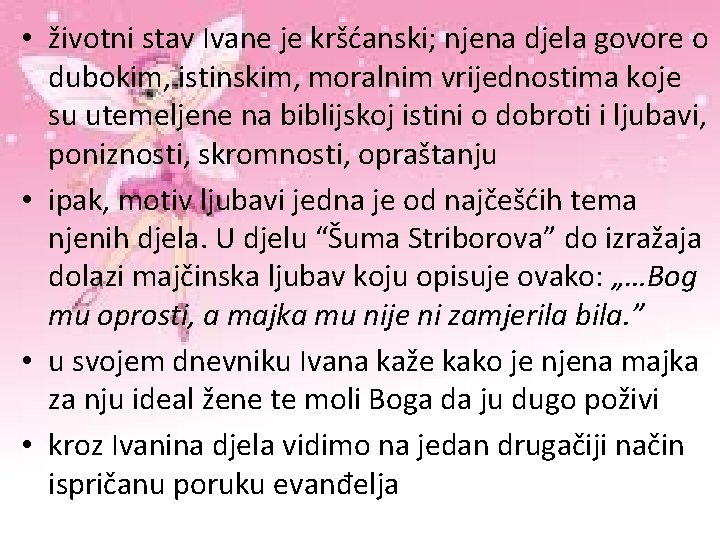 • životni stav Ivane je kršćanski; njena djela govore o dubokim, istinskim, moralnim vrijednostima koje su utemeljene na biblijskoj istini o dobroti i ljubavi, poniznosti, skromnosti, opraštanju • ipak, motiv ljubavi jedna je od najčešćih tema njenih djela. U djelu “Šuma Striborova” do izražaja dolazi majčinska ljubav koju opisuje ovako: „…Bog mu oprosti, a majka mu nije ni zamjerila bila. ” • u svojem dnevniku Ivana kaže kako je njena majka za nju ideal žene te moli Boga da ju dugo poživi • kroz Ivanina djela vidimo na jedan drugačiji način ispričanu poruku evanđelja