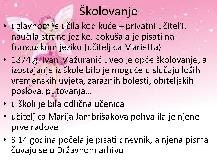 Školovanje • uglavnom je učila kod kuće – privatni učitelji, naučila strane jezike, pokušala je pisati na francuskom jeziku (učiteljica Marietta) • 1874. g. Ivan Mažuranić uveo je opće školovanje, a izostajanje iz škole bilo je moguće u slučaju loših vremenskih uvjeta, zaraznih bolesti, obiteljskih poslova, putovanja… • u školi je bila odlična učenica • učiteljica Marija Jambrišakova pohvalila je njene prve radove • S 14 godina počela je pisati dnevnik, a njena pisma čuvaju se u Državnom arhivu