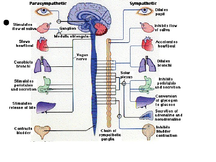 c) autonomni živčani sustav -rad ovog sustava je stalan, neprekidan -odvija se bez utjecaja volje -podjela: simpatički i parasimpatički -antagonisti su -inerviraju: -glatko mišićno tkivo -poprečnoprugasti srčani mišić -žljezdano tkivo