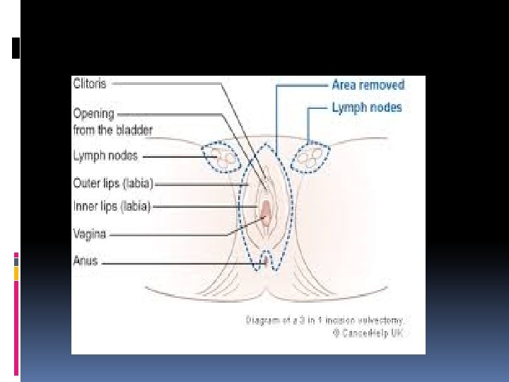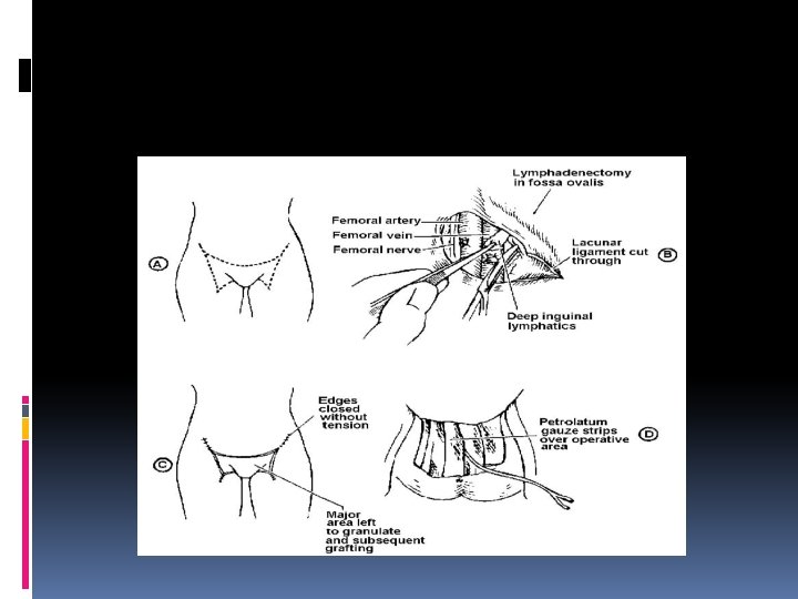 TREATMENT Surgery is main stay of treatment 1 -Radical vulvectomy and bilateral inguinofemoral lymphadenectomy with or without pelvic lymph adnectomy Reduced the mortality from 80% to 40% to control the lymphatic spread, remove large area of normal skin in the groins. The purpose of this operation is to remove the vulva, its adjacent structures, a margin of normal tissue, and the inguinal lymph nodes from the anterior superior iliac spine to the abductor canal in the leg Primary wound closure was rarely achieved.