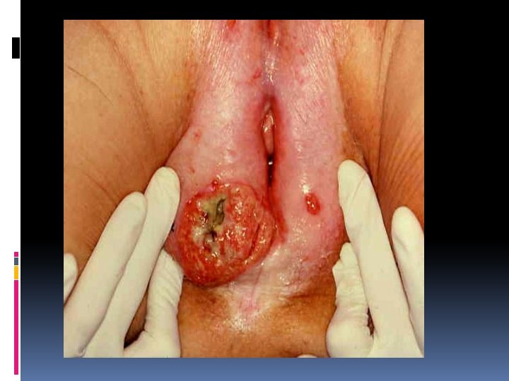 Epidemniology: Two different etiological types of vulual cancer: 1 st type seen mainly in younger patient related to HPV and smoking and commonly assosciated with VIN of warty type. 2 nd more common type seen in elderly usually associated with long standing lichen seclerosus is common. Vulual cancer occur in association with lymhpogranuloma venerum and granuloma inguinale. 5% of patients have positive result on serologic testing for syphilis If occur at earlier age and associated with graver prognosis