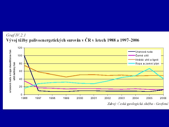 • Pokles těžby černého uhlí, stabilizace těžby hnědého uhlí • Pokles těžby vysokoprocentních vápenců • Rekultivace ploch poškozených těžbou • Pokles a stabilizace emisí z energetiky • Pokles znečištění vod z průmyslu • Zlepšování struktury vozového parku osobních aut, ale ne dopravních, růst znečištění z dopravy • Pokles negat. vlivu zemědělství, výroby, aplikace hnojiv a pesticidů, rozvoj ekologického zemědělství • Nárůst produkce obalů, • Růst staveb na zelené louce • Vysoká koncentrace návštěvníků v chráněných lokalitách