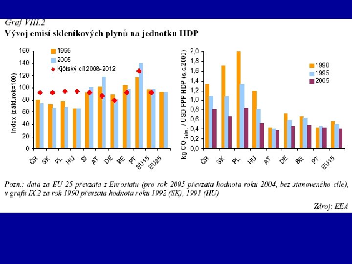 • nižší celková spotřeba vody na obyvatele; • poměrně vysoký podíl obyvatel připojených na veřejné zdroje pitné vody a na veřejnou kanalizaci; • vysoký podíl čištěných odpadních vod z veřejné kanalizace; • nižší dávky dusíkatých hnojiv na plošnou jednotky obdělávané půdy; • příznivá situace u intenzity živočišné výroby; • relativně příznivá situace v podílu chráněných území na celkové rozloze státu; • příznivý vývoj u množství průmyslového odpadu na jednotku vytvořeného HDP • relativně nízká plošná hustota silniční sítě i hustota na obyvatele; • podstatně nižší hustota silničního provozu; • relativně nižší spotřeba energie v dopravě s ohledem na jednotku vytvořeného • většinou výrazně vyšší měrné emise SO 2, NOx a CO 2 (na obyvatele, na jedno • vysoká energetická náročnost národního hospodářství vzhledem k jednotce vy • vysoký podíl uhlí na tuzemské spotřebě primárních energetických zdrojů; • vysoký podíl zemědělské půdy z celkové rozlohy státu a rovněž vysoký stupeň • poměrně vysoký podíl těžby dřeva ku přírůstu; • kriticky vysoký podíl ohrožených druhů živých organismů; • nízká úroveň zahraniční rozvojové spolupráce z hlediska poskytování finančníc