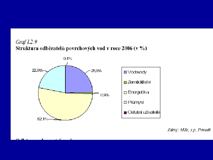 Voda v České republice Množství vody Roční srážky – 485 – 880 mm, ø 700 mm 55 MLD km 3 /rok vody, které se odpaří, odteče, vsákne - ČR je chudá na vodní zdroje - Zdroje vody: voda povrchová a podpovrchová – podzemní - Spotřeba povrchové vody: 45 % chlazení v elektrárnách 28 % průmysl 27 % veřejný odběr - Spotřeba podzemní vody: 71 % veřejný odběr 21, 5 % průmysl