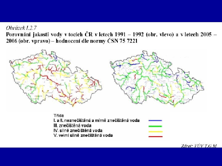 Kvalita vody • • Sledována cca 300 stanicemi – hlavní toky+ 340 vrtů - Systém klasifikace kvality vody I. , II. , (neznečištěná) III. znečištěná IV. vysoce znečištěná V. extrémně znečištěná - Typy znečištění : organické, živinami, dusíkem, fosforem.