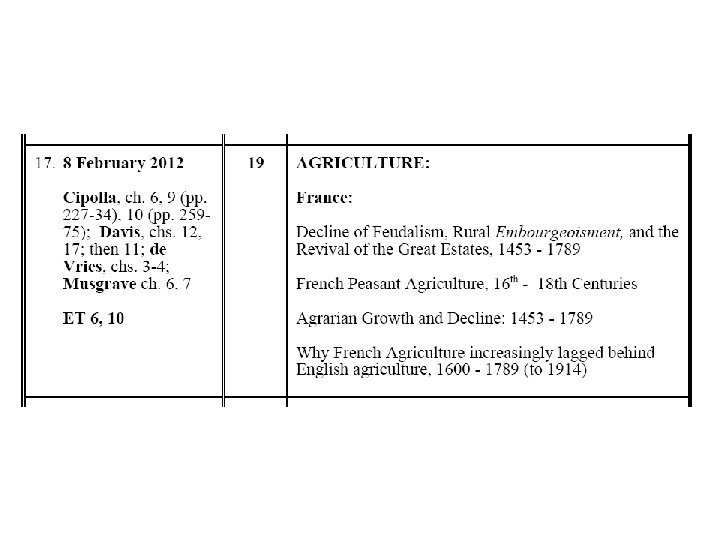 Structure of Early-Modern French Agriculture: North & South (2) • - b) Role of Parlement de Paris: the Marc Bloch thesis (as seen before) • -i) from time of Philip II Augustus (1180 -1223) French kings sought to extend their powers from Paris - in opposition to the feudal aristocracy • - used Parlement de Paris (royal courts) to undermine judicial and economic powers of the feudal aristocracy: • -ii) by hearing legal appeals on cases involving peasant property rights: invariably supporting the peasantry