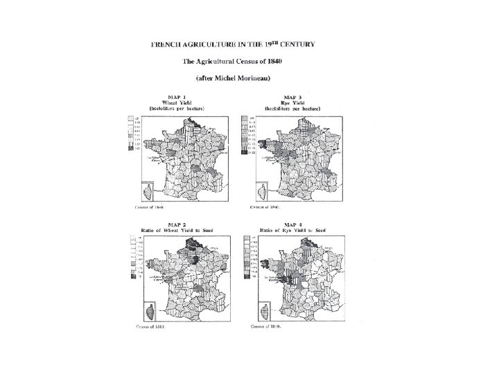 Agrarian Changes in Early Modern France: to the Revolution - 7 • 5) Growth, Change, Stagnation in French Agriculture, 1453 – 1789 • a) problem: enormous regional variations • - see Morineau map for France in 1840 • - regions in Paris basin and bordering Low Countries had high productivity • - many other regions of low productivity, especially in the south & south-east