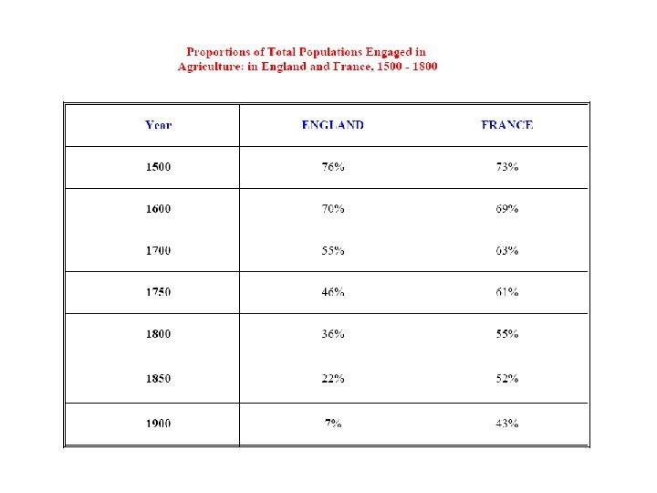 Structure of Early-Modern French Agriculture: North (4) • b) barriers to improving agricultural productivity • iii) population growth from 11 th century (and again from 16 th century): expansion of arable at expense of pasture lands insufficient livestock products + manure limited fertility of the arable lands • iv) virtually no enclosures thus almost no Convertible Husbandry • c) low productivity of northern (and southern) French agriculture • i) low levels of nutrition periodic problems of famine • ii) limited supplies of labour, food, raw materials, capital, market demand