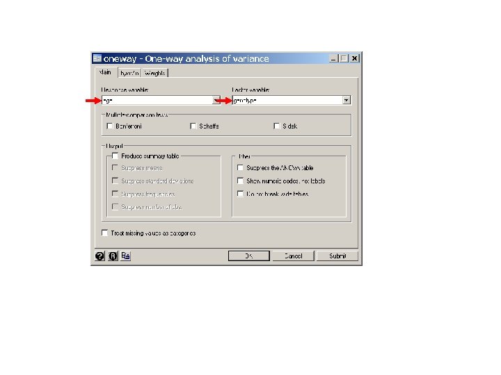 . lincom 3. genotype - 2. genotype {14} ( 1) - 2. genotype + 3. genotype = 0. 0 ---------------------------------------age | Coef. Std. Err. t P>|t| [95% Conf. Interval] -------+--------------------------------(1) | -14. 00431 3. 778935 -3. 71 0. 000 -21. 57443 -6. 434194 ---------------------------------------. *. * Perform a Kruskal-Wallis analysis of variance. *. * Statistics > Nonparametric. . . > Tests of hypotheses > Kruskal-Wallis. . kwallis age, by(genotype) {15} Test: Equality of populations (Kruskal-Wallis test) +--------------+ | genotype | Obs | Rank Sum | |-----+----------| | 1. 6/1. 6 | 14 | 494. 00 | | 1. 6/0. 7 | 29 | 999. 50 | | 0. 7/0. 7 | 16 | 276. 50 | +--------------+ chi-squared = probability = 12. 060 with 2 d. f. 0. 0024 chi-squared with ties = probability = 0. 0024 12. 073 with 2 d. f.
