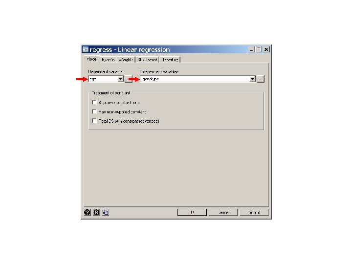 . . . * * Repeat analysis using linear regression * * Statistics > Linear models and related > Linear regression regress age i. genotype {9} Source | SS df MS -------+---------------Model | 2315. 73355 2 1157. 86678 Residual | 8245. 79187 56 147. 246283 -------+---------------Total | 10561. 5254 58 182. 095266 Number of obs F( 2, 56) Prob > F R-squared Adj R-squared Root MSE = = = 59 7. 86 0. 0010 0. 2193 0. 1914 12. 135 ---------------------------------------age | Coef. Std. Err. t P>|t| [95% Conf. Interval] -------+--------------------------------genotype | 2 | -. 2635468 3. 949057 -0. 07 0. 947 -8. 174458 7. 647365 {10} 3 | -14. 26786 4. 440775 -3. 21 0. 002 -23. 1638 -5. 371915 | _cons | 64. 64286 3. 243084 19. 93 0. 000 58. 14618 71. 13953 {11} ---------------------------------------. oneway age genotype Analysis of Variance Source SS df MS F Prob > F ------------------------------------Between groups 2315. 73355 2 1157. 86678 7. 86 0. 0010 Within groups 8245. 79187 56 147. 246283 ------------------------------------Total 10561. 5254 58 182. 095266