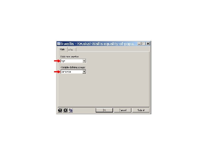 . * Statistics > Nonparametric. . . > Tests of hypotheses > Kruskal-Wallis. . kwallis age if genotype ~=1, by(genotype) {17} Test: Equality of populations (Kruskal-Wallis test) +--------------+ | genotype | Obs | Rank Sum | |-----+----------| | 1. 6/0. 7 | 29 | 798. 50 | | 0. 7/0. 7 | 16 | 236. 50 | +--------------+ chi-squared = probability = 9. 722 with 1 d. f. 0. 0018 chi-squared with ties = probability = 0. 0018 9. 734 with 1 d. f. {17} This command repeats the preceding command using the Kruskal-Wallis test. This test is equivalent to the rank-sum test when only two groups are being compared. Note that the P values from these tests both equal 0. 0018.