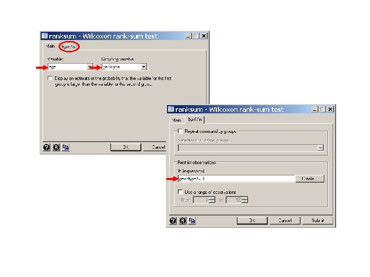 . * Statistics > Nonparametric. . . > Tests. . . > Wilcoxon rank-sum test. ranksum age if genotype ~=2, by(genotype) Two-sample Wilcoxon rank-sum (Mann-Whitney) test genotype | obs rank sum expected -------+----------------1. 6/1. 6 | 14 289 217 0. 7/0. 7 | 16 176 248 -------+----------------combined | 30 465 unadjusted variance adjustment for ties adjusted variance 578. 67 -1. 67 -----576. 99 Ho: age(genotype==1. 6/1. 6) = age(genotype==0. 7/0. 7) z = 2. 997 Prob > |z| = 0. 0027