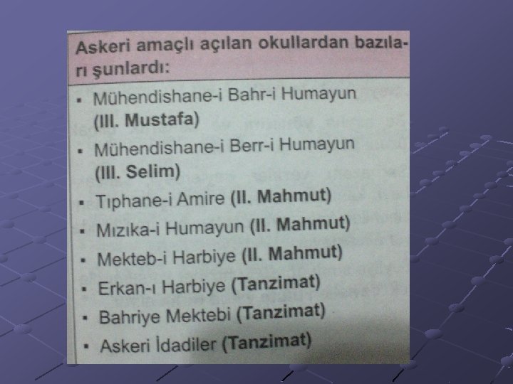 (2) Öğretim Kurumları a) Askeri Kurumlar Deniz kuvvetleri için deniz subayı ve mühendisleri yetiştirmek amacıyla 1773 yılında "Mühendishane-i Bahrı Hümayun" okulu açıldı. Okulun öğretim kadrosu Fransız teknisyenlerden oluşuyordu. III. Selim döneminde 1792'de "Humbarahane" ve daha sonra "Mühendishane-i Berr-i Hümayun'' okulları açıldı. Mühendishanede fizik, matematik ve topçulukla ilgili kitaplardan oluşan bir kütüphane kuruldu.