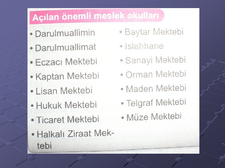 II. Abdülhamit döneminde, 1885 yılında "Mektebi Sanayi", hakim yetiştirmek için "Mektebi Hukuk-ı Şahane" açıldı (1878).