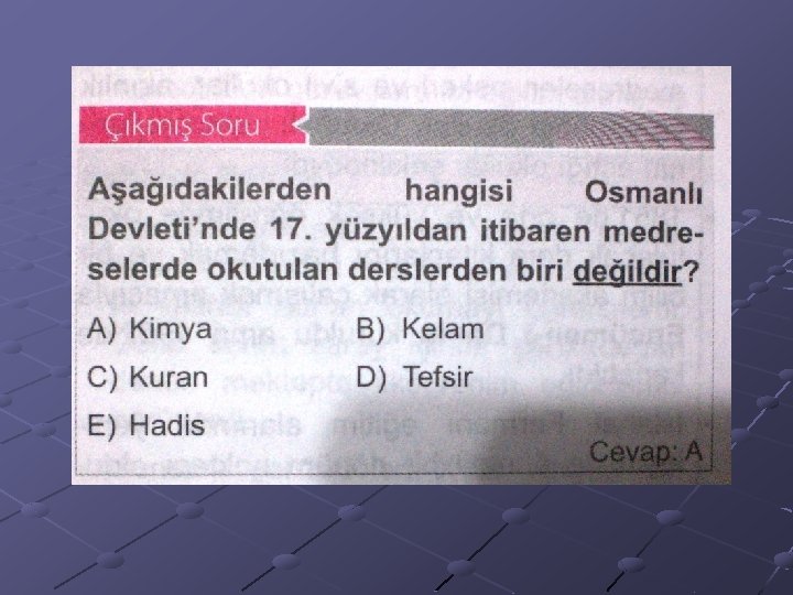 OSMANLIDA EĞİTİM D-Medrese Eğitimi E-Dini Kurumlardaki Eğitim Diğer İslam Devletleri’nde olduğu gibi Osmanlılar’da da temel eğitim-öğretim kurumları medreseler idi. Osmanlılar, Osmanlı Devleti’nde halkı medreselerini Büyük Selçuklu, Anadolu bilgilendiren önemli Selçukluları ve diğer İslam devletlerini kurumlardan biri de cami, örnek alarak kurdular. Kısa zamanda şöhret bulan bu medreselere, İslam dünyasındaki diğer ülkelerden çok sayıda talebe ve âlim akın etmeye başladı. Medreseler de akademik kariyer basamakları sırası ile şöyleydi: Softa, tekke ve zaviyelerdir. Bu kurumlar ilk zamanlarda birer öğretim yeri gibi faaliyette bulunmuşlardır.