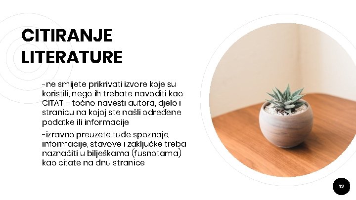 CITIRANJE LITERATURE -ne smijete prikrivati izvore koje su koristili, nego ih trebate navoditi kao CITAT – točno navesti autora, djelo i stranicu na kojoj ste našli određene podatke ili informacije -izravno preuzete tuđe spoznaje, informacije, stavove i zaključke treba naznačiti u bilješkama (fusnotama) kao citate na dnu stranice 12