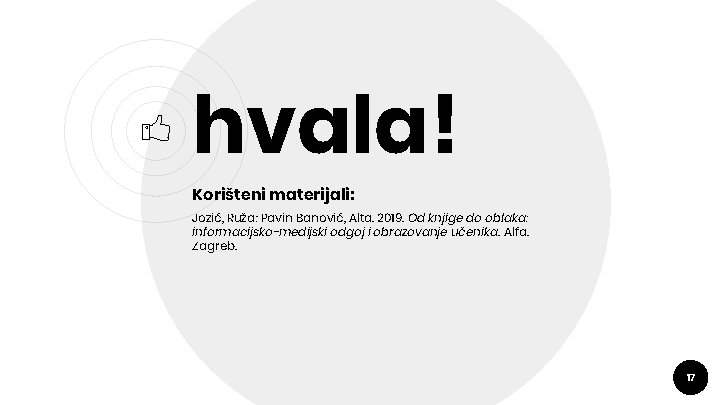 hvala! Korišteni materijali: Jozić, Ruža; Pavin Banović, Alta. 2019. Od knjige do oblaka: informacijsko-medijski odgoj i obrazovanje učenika. Alfa. Zagreb. 17