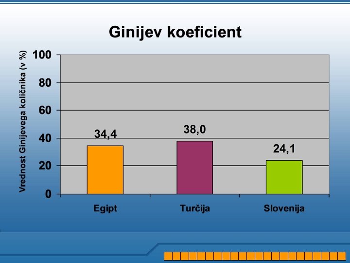 Trije kazalci neenakosti porazdelitve dohodka 1. Ginijev koeficient, 2. Razmerje decilnih razredov (90/10) ter 3. Razmerje kvintilnih razredov (80/20) Država in leto izračuna Ginijev količnik (%) Razmerje decilnih razredov (90/10) Razmerje kvintilnih razredov (80/20) Egipt (1999 -00) 34, 4 8, 0 5, 1 Turčija (2003) 38, 0 16, 8 9, 3 Indeks Egipt/Turčija 90, 5 47, 6 54, 8