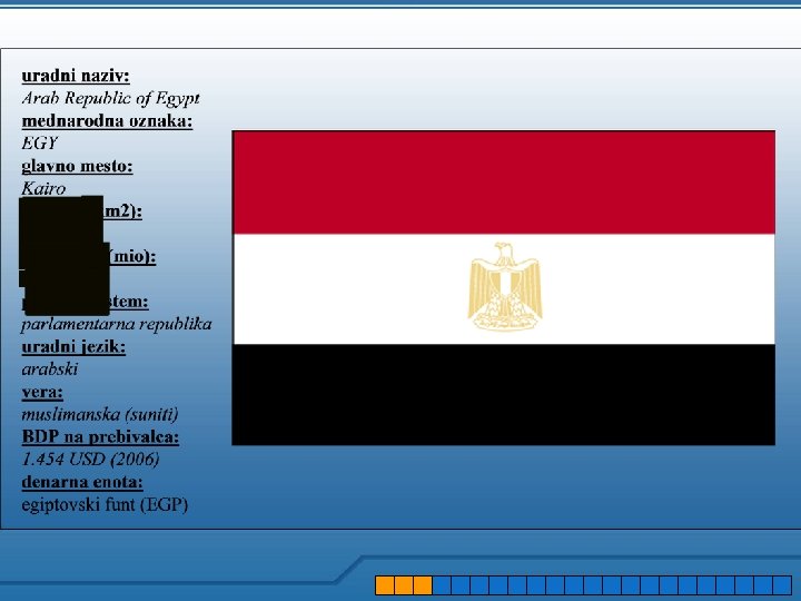 3. PEST analiza – politično okolje Egipt je de iure parlamentarna republika pod vodstvom Hosnija Mubaraka, de facto pa pol-predsedniška republika, saj v praksi egiptovski predsednik predseduje tudi vladi, zato nekateri Egipt opisujejo tudi kot sistem vojaške diktature. Vladajoča Mubarakova Nacionalna Demokratska Stranka je pravzaprav brez prave opozicije. Potencialno še najmočnejše v tem oziru: skrajno islamsko gibanje Muslimanski Bratje, ki zaradi ustavne prepovedi religiozno osnovanih strank sicer deluje v ilegali. Egipt je najpomembnejši ameriški zaveznik v arabskem svetu, hkrati pa tudi največji prejemnik ameriške pomoči. Egipt je vodilna arabska država; sedež Zveze Arabskih Držav.