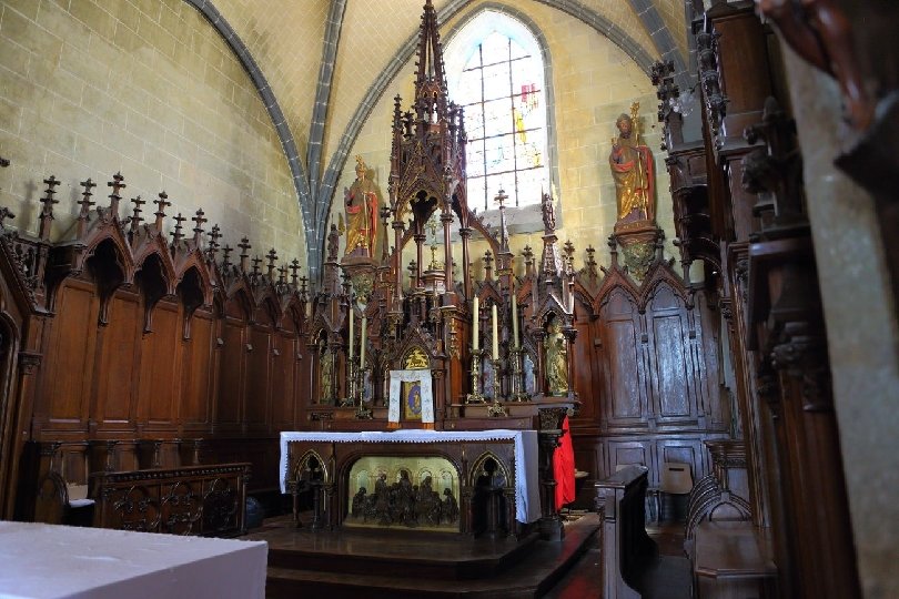 Les voûtes de la nef actuelle, de style néogothique datant de 1903, cachent l'ancien douvis originel en bois qui subsiste encore dans la sacristie.