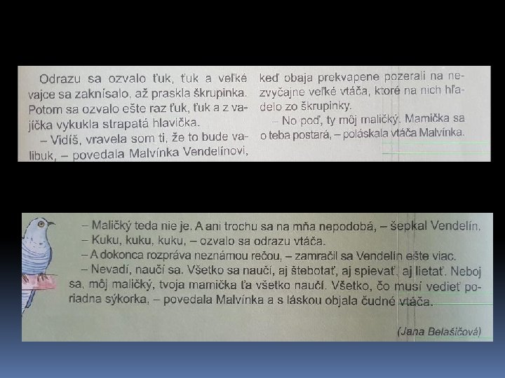 Vypočuj si rozprávku Vtáča od Jany Belašičovej po častiach. Na lepšie pochopenie pomôžu obrázky a dialógy. Malvínka, nech sa páči červík. Naozaj, je akési veľké. Určite z neho vyliahne valibuk (óriás mesehős) Ďakujem, Vendelín. Malvínka, čože si to zniesla za vajíčko? Akési je iné.