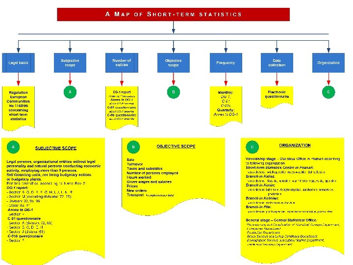 What is a map of a system of statistical surveys? Generalized, integrated and ordered description of statistical surveys including the following elements: • Basic information about surveys containing: survey scope, target population, survey frequency, survey administration date, data collection methods, survey implementation. • A description of input data (X) – sources and forms of data; input variables, quality assessment criteria (number of refusals, missing data, error estimates). • A description of survey results (Y) i. e. the format (raw data, adjusted seasonally or on a working day basis, trend), form of presentation (indicator, absolute value), date and place of releasing data or making them available. • A description of the transformation of input data into results, which is essential for further, more in-depth analyses.