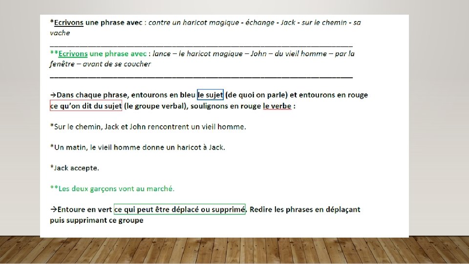 Jack et John échangent leur vache contre un haricot. ……………………………………………………………. . Jack et John sont très pauvres. Ils travaillent avec leur mère, dans une petite ferme. Un matin, Jack et John ……………………………………………………………… vont au marché. La veille, ils ont décidé de vendre leur vieille vache car elle ne donne plus de lait. …………………………………………………………………. Sur le chemin, ils rencontrent un vieil homme. Celui-ci les appelle et leur dit : ……………………………………………………………… « Vous êtes bien matinaux, Jack et John. Où allez-vous avec cette vache ? ……………………………………………………………… - Vous avez l’intention de la vendre ? ……………………………………………………………… -Nous n’avons plus d’argent alors nous devons vendre notre vache. Nous allons au marché. …………………………………………………………… -Si vous voulez, vous pouvez devenir riches, dit le petit vieux. Vous voyez, ce haricot, il est magique. Si vous ………………………………………………………………le plantez, en une nuit, il poussera jusqu’au ciel. Je vous le donne en échange de votre vache. » …………………………………………………………………