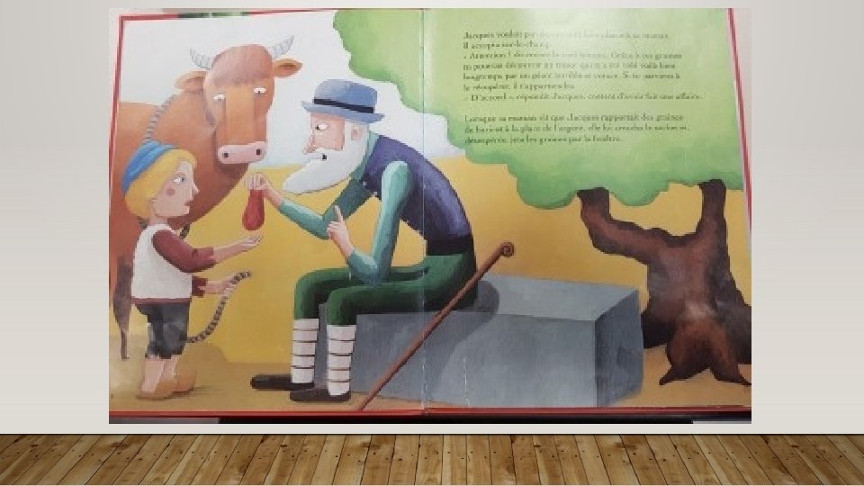Jack est très pauvre. Il travaille avec sa mère, dans une petite ferme. Un matin, Jack va au marché. La veille, il a décidé de vendre sa vieille vache car elle ne donne plus de lait. Sur le chemin, il rencontre un vieil homme. Celui-ci l’appelle et lui dit : « Tu es bien matinal, Jack. Où vas-tu avec cette vache ? Tu as l’intention de la vendre ? - Je n’ai plus d’argent alors je dois vendre ma vache. Je vais au marché. - Si tu veux, tu peux devenir riche, dit le petit vieux. Tu vois, ce haricot, il est magique. Si tu le plantes, en une nuit, il poussera jusqu’au ciel. Je te le donne en échange de ta vache. » ** Jack est émerveillé à l’idée de posséder une plante magique, alors il accepte. En le voyant avec le haricot, sa mère est furieuse. Elle finit par s’effondrer sur une chaise en pleurant comme une fontaine. Alors Jack lance le haricot par la fenêtre et il se couche le