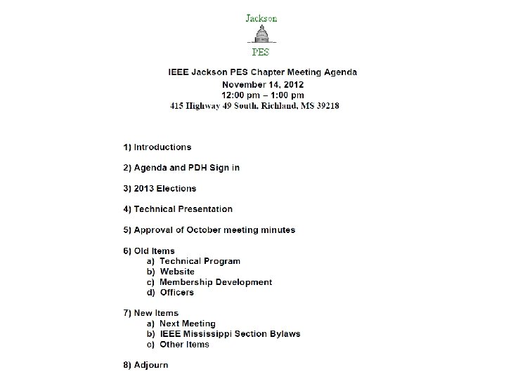 New Items • Next Meeting – December 12, noon • Next Meeting Location – Entergy Nuclear HQ if available? – Catering if Siemens location? – Corporate Sponsor? • Next Presenter – Siemens – Surge Arresters • 2013 Elections